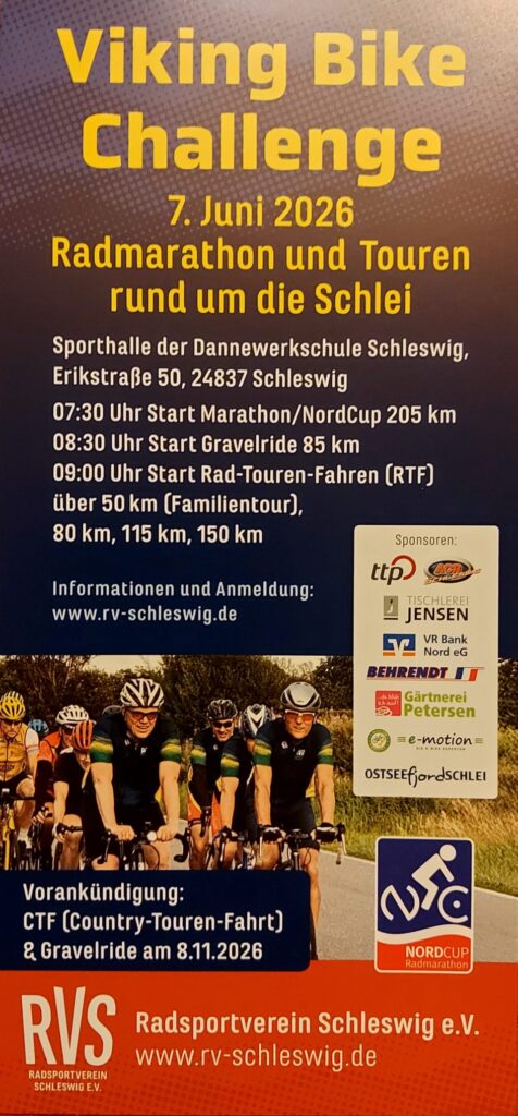 Herzlich willkommen beim Radsport Verein Schleswig e. V. Anmeldung läuft! Viking Bike Challenge am 7. Juni 2026! Info & Anmeldung Text u. Fotos: Doris Zimmer Liste der Teilnehmenden 29.11.2025: Nordcup-Finisher 2025! 🙂 weiterlesen Text u. Fotos: Doris Zimmer Bericht von Maik Viking Bike Winter Challenge Zum 21. Mal finden die Langsee-OCTF/Gravel über 35 km, 55 km oder 70 km (Gravel) am 09.11.2025 statt! Foto-Rückblick E-Bike auf der CTF-/Gravel-Tour am 09.11.2025 ausprobieren? Dann Hier klicken! Bronze bei Triathlon-WM in Wollongong (Australien) im Mixed Relay Die Mitglieder des RVS gratulieren ihrem Mitglied Kerstin Günter (2. v. r.) zu diesem großartigen Erfolg! 🙂 19.10.2025 Hans-Georg Laukötter, Johannes Guhlmann und Ralf Althüser fuhren Flensburg – Brocken weiterlesen Bericht: Ralf Althüser, 10/2025 Johannes Guhlmann, Jan Svendsen und Ralf Althüser fuhren Flensburg – Viborg weiterlesen Bericht: Ralf Althüser, 10/2025 Radwanderer on Tour:Mehrtagesfahrt nach Ratzeburg: anspruchsvoll und sehr schön! weiterlesen 20.09.2025, M. D. & H. D. 12. Race across Schleswig am13. September 2025 einige Eindrücke Trikots für die Besten der Radfahrprüfungen an der Bugenhagenschule weiterlesen 20. Juni 2025 RV Schleswig Vikings and friends rocken die Vätternrunde 2025! weiterlesen D. Z. 20.06.2025 kurzes Video dazu Permanente RTF 1 Angeln-Geest-Rundfahrt 2 Durch Angeln zum Landarzt 3 Zum Aschberg 4 Naturpark Schlei Graveltour 5 Große Schleirunde Viking Bike Challenge 2025 Rückblick Die Strecken 2025 Donnerwetter bei der Viking-Bike-Challenge Trikot und Buff zum Schlei-Event können hier bestellt werden! Trikot- und Buff-Bestellung Unser Facebook zum Event RVS ist Radwanderverein des Jahres 2024 in Schleswig-Holstein! weiterlesen Die Wochenschau berichtet (12.4.25)